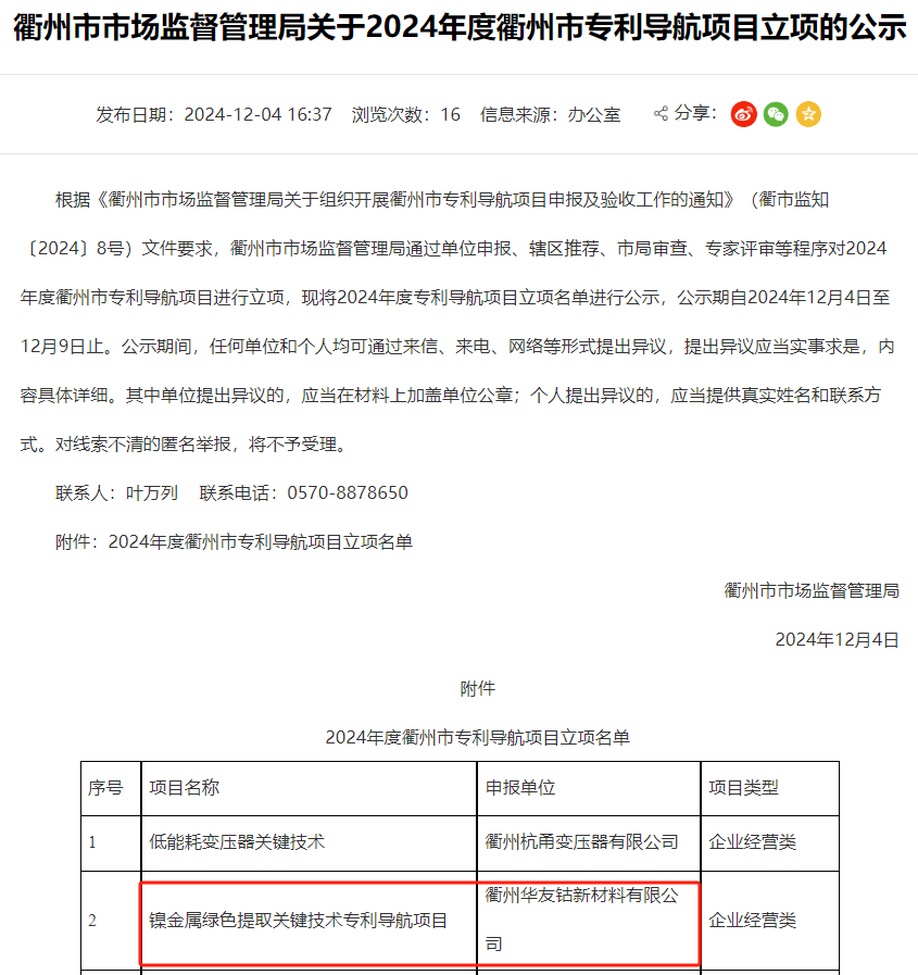 2024年12月4日,衢州市市場(chǎng)監(jiān)督管理局就2024年度衢州市專(zhuān)利導(dǎo)航項(xiàng)目立項(xiàng)名單對(duì)外進(jìn)行公示,公示期自2024年12月4日至12月9日止。